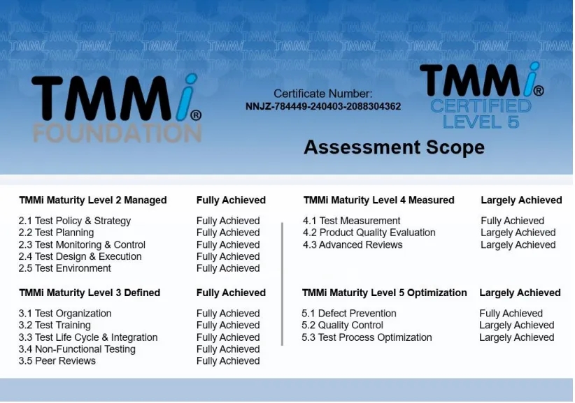 在本次TMMi5级认证过程中,神州信息咨询认证团队依据TMMi基金会推荐使用的IDEAL模型,进行了差距分析、体系优化建模、项目试点、预评估与正式评估等一系列改进和认证评估工作。TMMi咨询评估团队经过客观、认真细致而全面的评估,一致确认lewin乐玩融信在TMMi高成熟度方面表现出业界专业水平,完全符合TMMi5级的16个过程域标准。